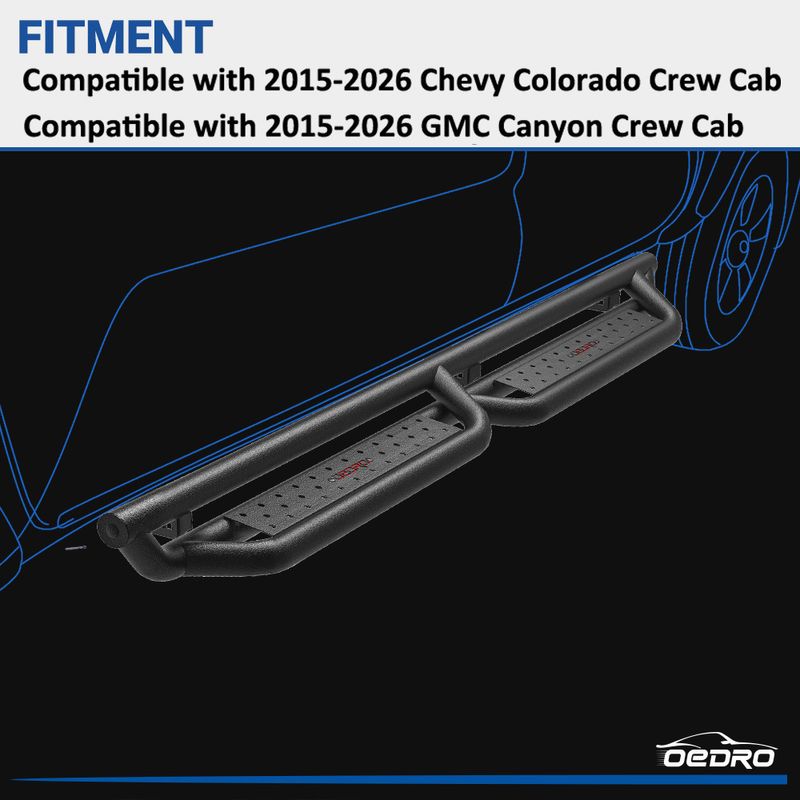 OEDRO Running Boards are designed for a perfect fit with the 2015-2026 Chevy Colorado and GMC Canyon Crew Cab. These rugged running boards feature a 6-inch leaf-shaped drop-down step pad that provides excellent accessibility, especially for trucks with lift kits and oversized tires. With a focus on both style and functionality, OEDRO running boards ensure your vehicle maintains optimal ground clearance while offering a sturdy, slip-resistant stepping surface for safe and easy entry.