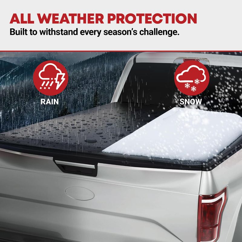 The soft roll-up tonneau cover is supported by 3 aluminum crossbars with slight arch to ensure water flows off the cover, preventing accumulation.