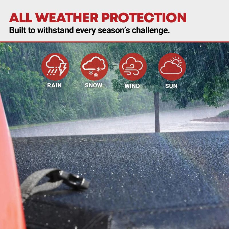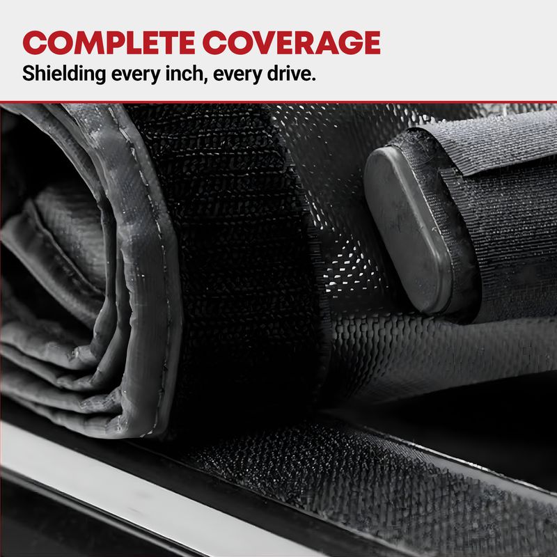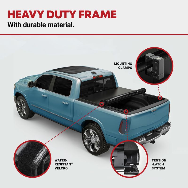 The soft roll-up tonneau cover is supported by 3 aluminum crossbars with slight arch to ensure water flows off the cover, preventing accumulation.