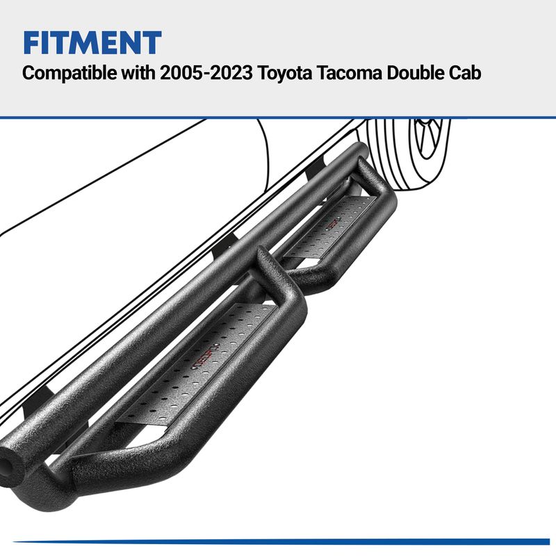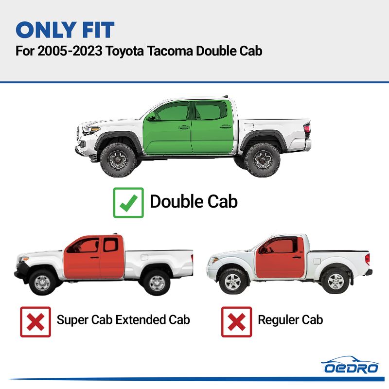 OEDRO running boards will be perfectly compatible with the 2005-2023 Toyota Tacoma Double Cab. Features a flat profile to ensure ample ground clearance, which is critical for off-road rides. The low-profile design maintains the driving height while improving the driving experience and external aesthetic.