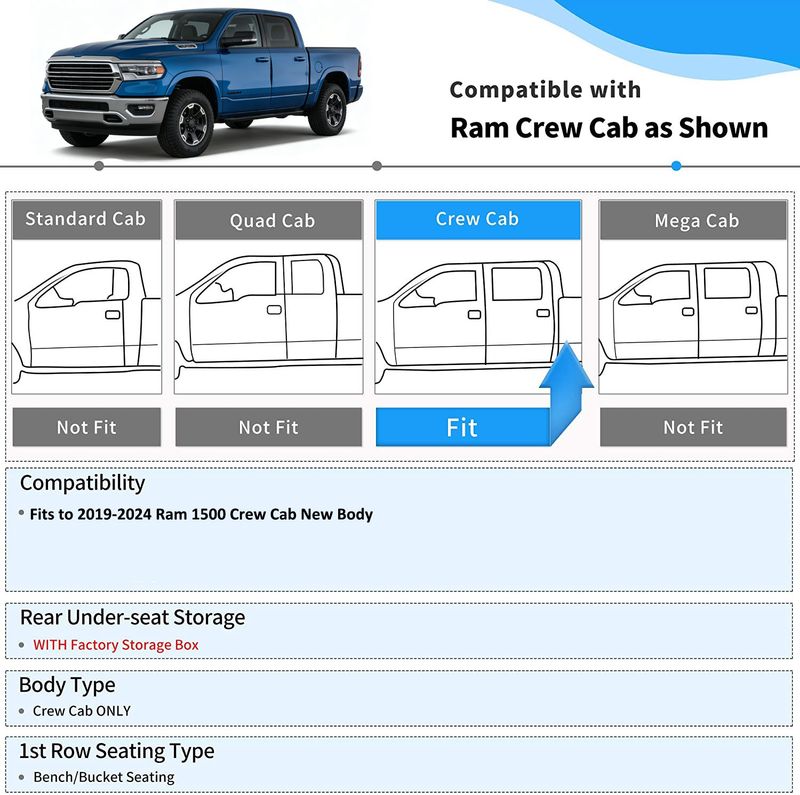 With advanced 3D laser scanning tech, the OEDRO front & back seat floor liner set is compatible with the 2019-2024 Dodge Ram 1500 New Body crew cab (NOT for Classic models) with under-seat storage.
