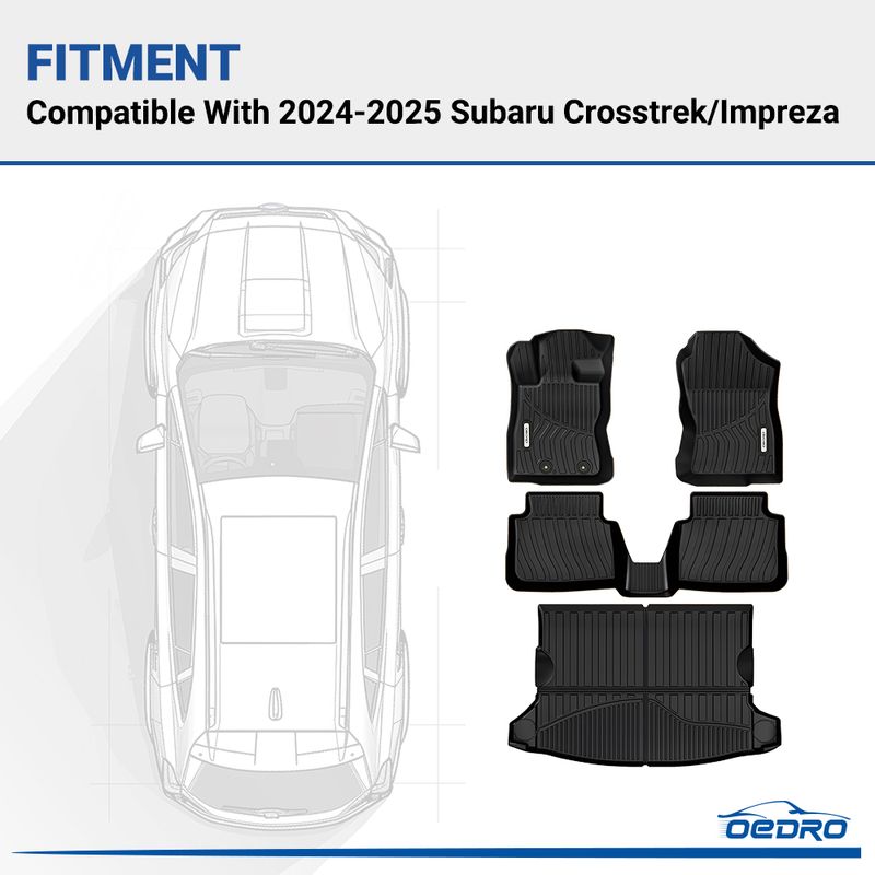 OEDRO Custom fit for the 2024-2025 Subaru Crosstrek, these floor mats feature advanced 3D laser scanning for precise fitment, ensuring safety and comfort by preventing pedal interference. Made from GRS-certified TPE, they’re durable, odorless, and ideal for all-weather protection. The stylish design seamlessly matches your vehicle’s interior while effectively containing dirt, mud, and spills. Easy to clean, these mats are backed by over 10 years of professional experience, offering reliable protection you can trust.