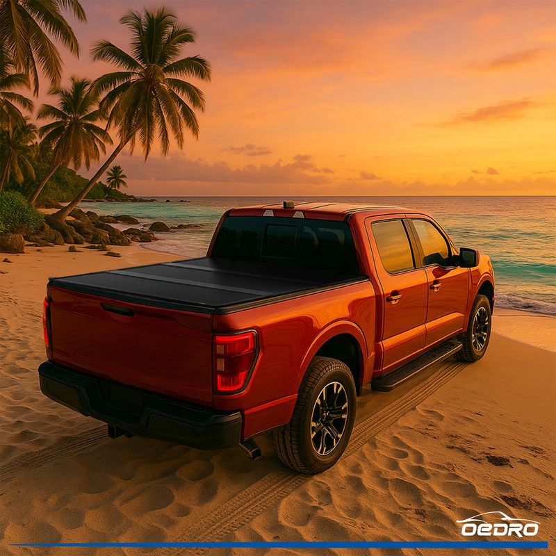 Enhance your truck's security and convenience with our premium hard Tri-Fold tonneau cover. Designed for effortless operation, it automatically latches into place when folded down—no manual locking required. Enjoy a sleek, durable design that protects your cargo while ensuring quick and easy access.
