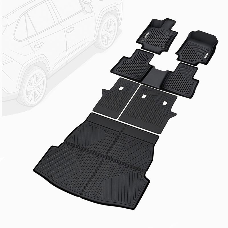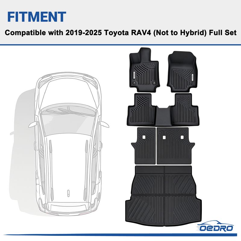Floor Mats and Cargo Liner Set Compatible with 2019-2025 Toyota RAV4 (Not fit to Hybrid Models); Does not fit vehicles with vinyl flooring. Made by unique precision digital laser scanning to protect the front and back of your vehicle’s footwell. Completely and accurately lines the interior carpet.