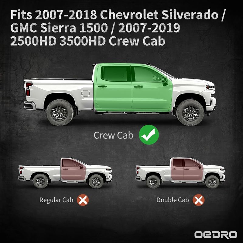 OEDRO Upgrade fit to your 2007-2018 Chevy Silverado/GMC Sierra 1500 Crew Cab, 2007-2019 2500HD 3500HD Crew Cab with heavy-duty running boards designed for durability, style, and everyday convenience. Featuring a custom fit and a rugged carbon steel build, these side steps support up to 450 lbs per side with dual-stage e-coating for rust resistance. The 3.9-inch drop-down design offers safer, easier access for passengers, while the 4-inch wide non-slip surface ensures secure footing in any condition. With quick, no-drill installation, you can easily enhance your truck’s look and functionality in under 20 minutes — perfect for work, travel, or outdoor adventures.