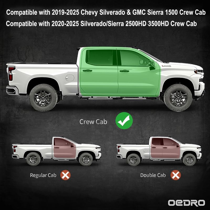 Upgrade your truck with OEDRO Drop Running Boards — the perfect blend of style, strength, and convenience. Designed for the 2019-2025 Chevy Silverado & GMC Sierra 1500 Crew Cab, 2020-2025 Silverado/Sierra 2500HD 3500HD Crew Cab, these heavy-duty carbon steel side steps provide effortless access, superior protection, and rugged appeal for everyday driving or off-road adventures.