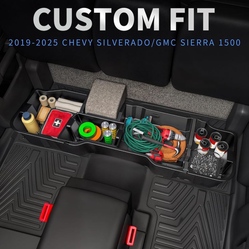 OEDRO Under Seat Storage Box with Screws uses the latest technology. No kidding, no smell in bad weather. This Is a great storage bin! You can have all Items stowed away safely in the truck including your two fishing rods and other tools. Will not move away! Very steady!