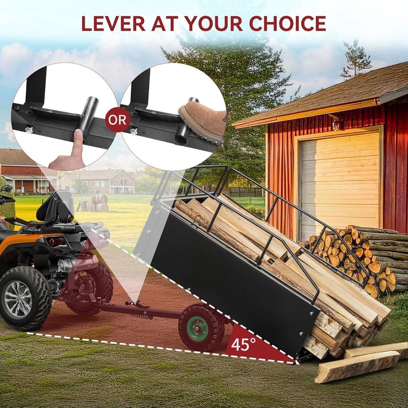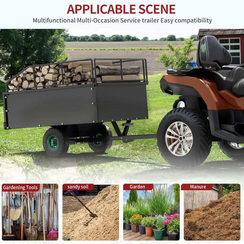 Convenient for Unloading:Our ATV garden trailer features added railings on three sides,providing a 15 cubic foot capacity for yard stuff. Collect more wood, soil, or garbage in a single trip, reducing the need for frequent hauls. Handle your yard work efficiently with our high-capacity trailer.And it boasts a user-friendly dump feature,allowing you to clear debris swiftly with a simple hand-pull or foot-step and a quick opening of the rear gate. Make your yard work less work and more comfortable