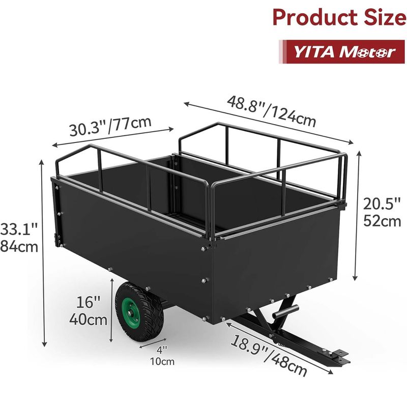 Specifications:YITAMOTOR dump trailer weighs 110lbs,16" x 4" pneumatic tires,thickness of the side plates is increased to 0.04".Experience effortless hauling with our trailer - your yard work companion