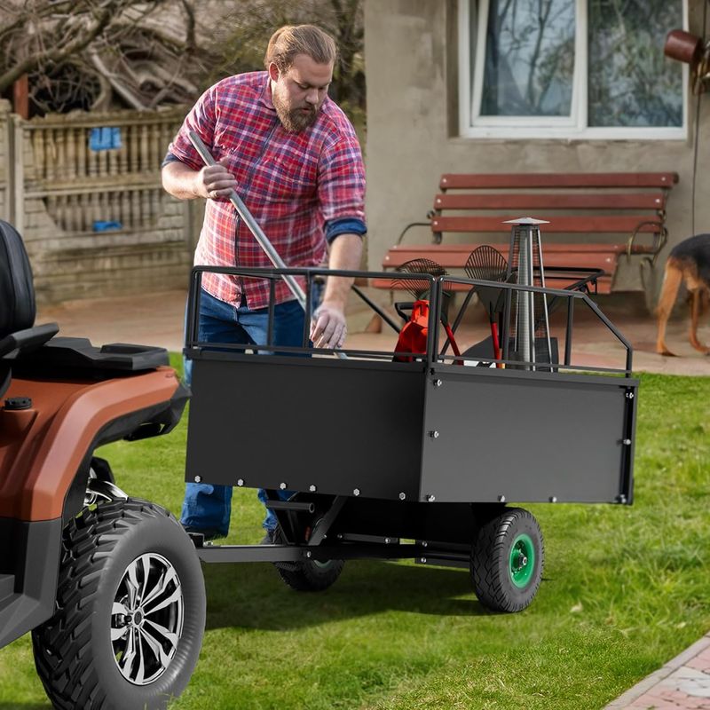 Upgrade Materials:The tow behind cart is made of ungraded heavy duty alloy steel, which can maximize its lifespan.Meanwhile,the guardrails of our dump cart for lawn tractor has been raised to prevent items from falling. And it is easy to clean. The dent-proof bed is made of reclycled materials,which performs well over multiple tests to ensure durability every season