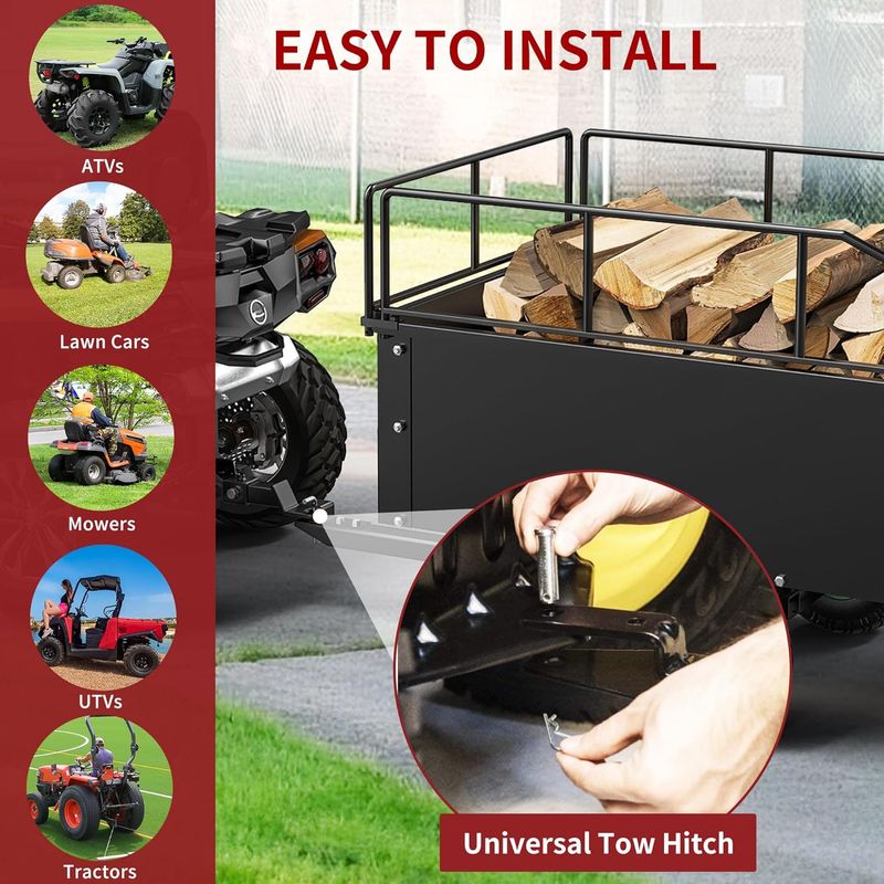 Easy to Assemble:The ATV trailer is equipped with a strengthened hitch which is east to connect to your tractors, lawnmowers, ATVs, UTVs,etc. And transform your yard work into a breeze