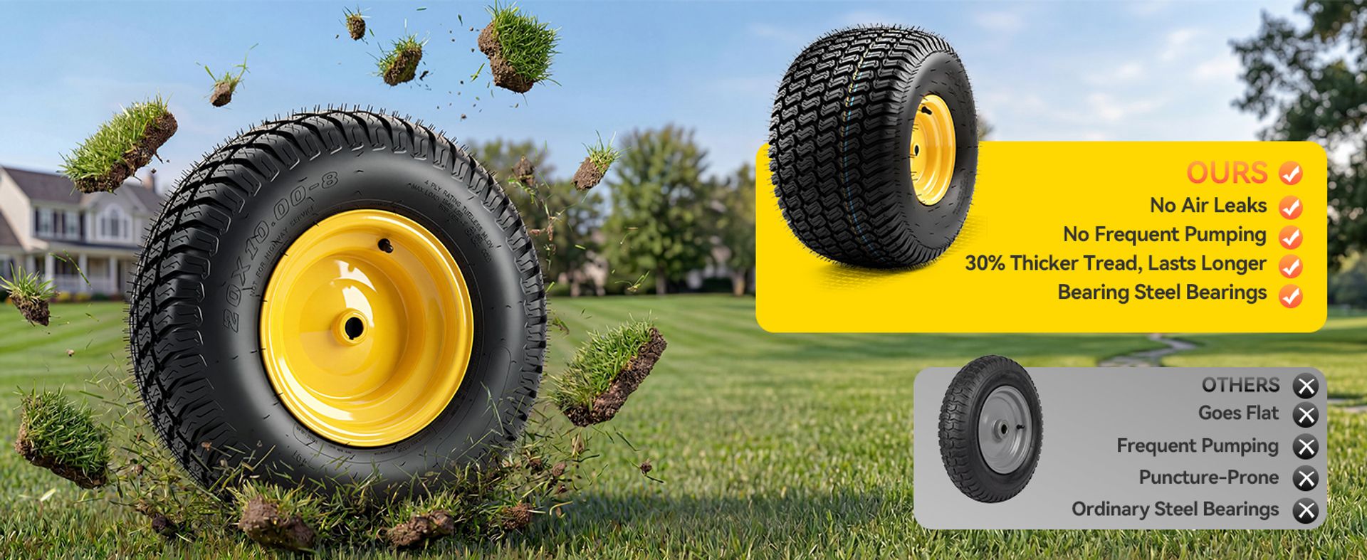 PLEASE NOTE: This kit includes 2PCS flat free 20x10-8 tires for riding lawn mowers. Not for highway use. Double‑check your mower's tire size and rim dimensions against our specs before buying to ensure a proper fit.