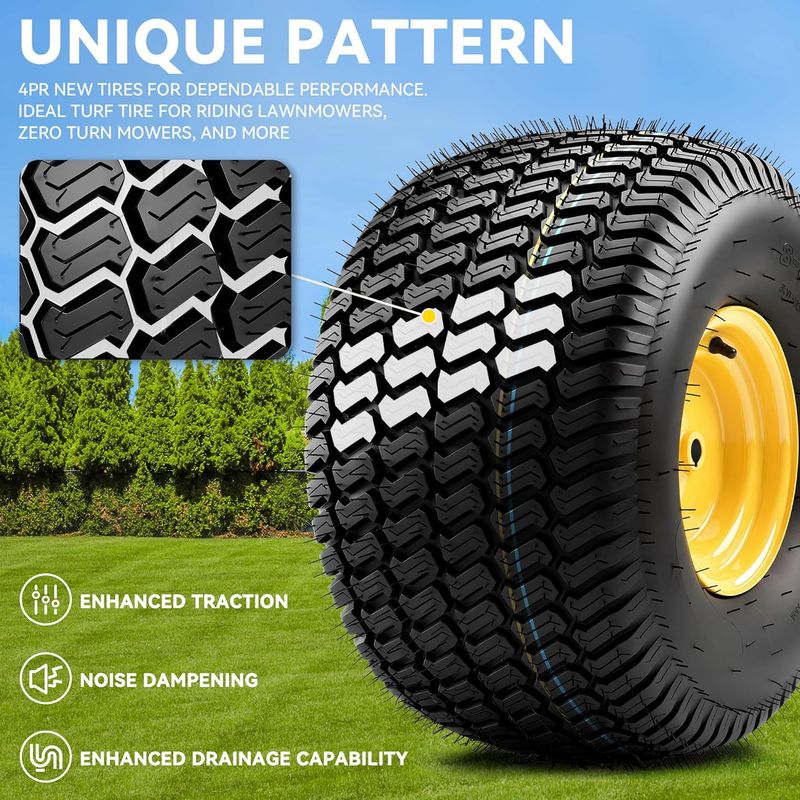 Unique tread pattern design reduces lawn damage by increasing friction between the tire and ground.