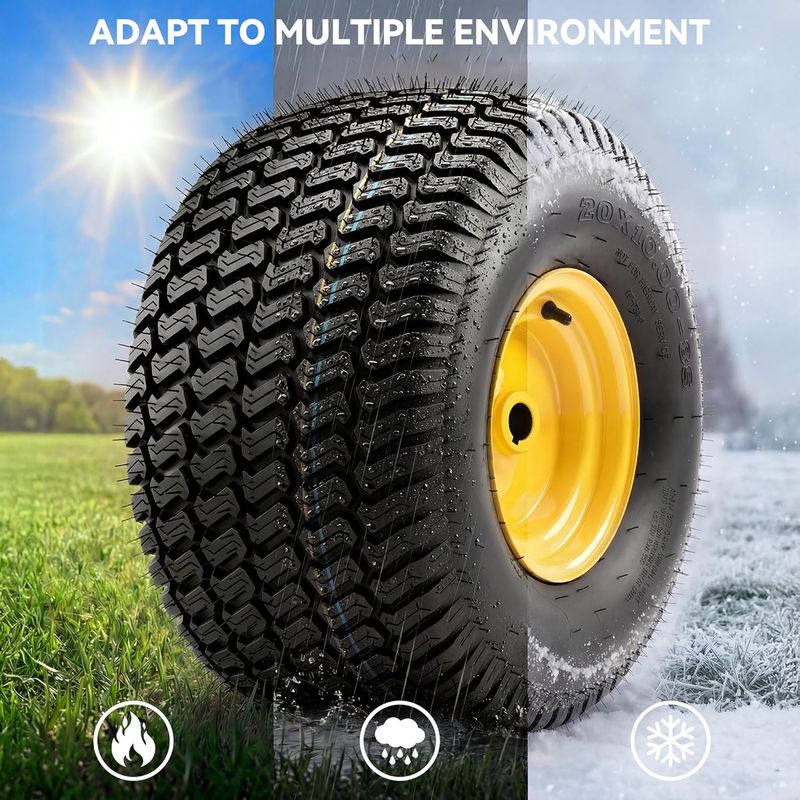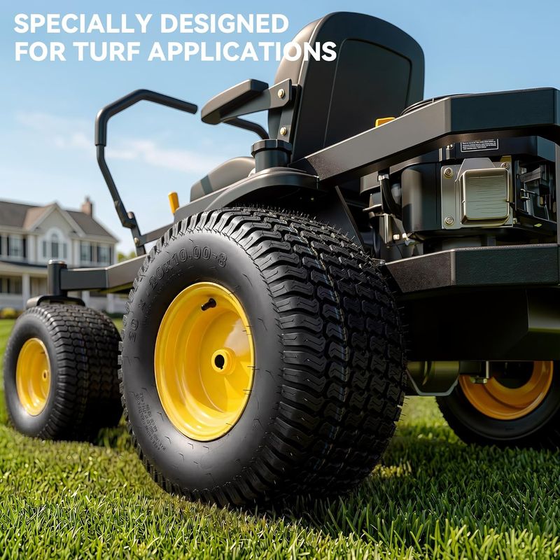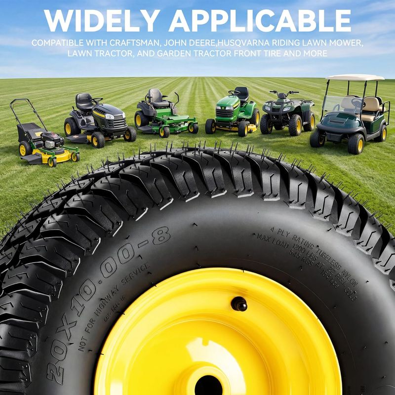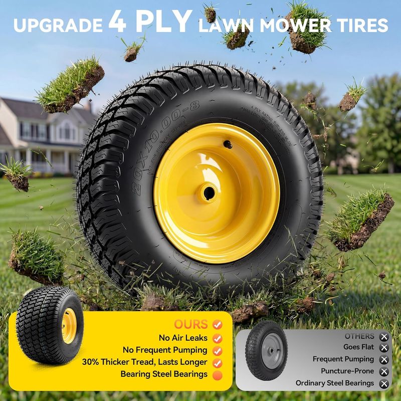 UPGRADED 4-PLY TIRE: Made from quality natural rubber, these 4‑ply pneumatic 20x10.00-8 lawnmower tires deliver high load capacity and durability. You get dependable traction and smooth rolling, whether you're mowing a small yard or handling large acreage – stable, reliable performance every time.