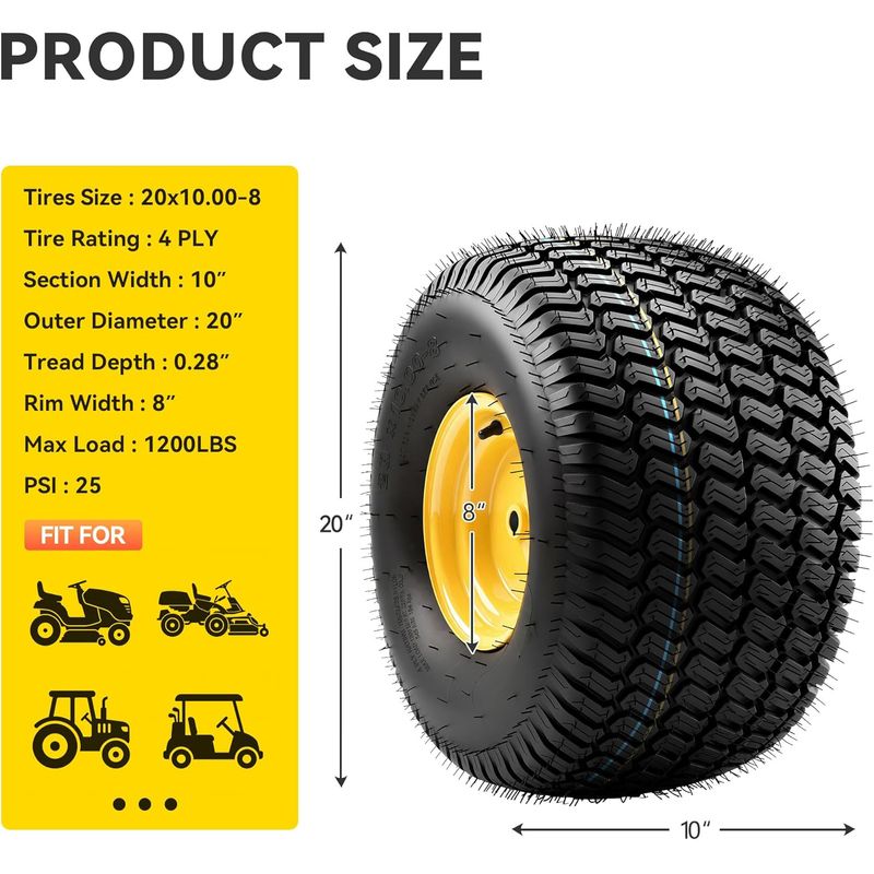 COMPATIBILITY & SPECIFICATIONS: This lawn mower tires kit fits most mowers with size 20x10.00-8". Tire Load Range: B/4PR/4PLY, Rim Width: 8", Section Width: 10", Outer Diameter: 20", Tread Depth: 0.3", Bore Hole Diameter: 3/4", Keyway Diameter: 3/16", Max Load: 1200 lbs, Max Inflation: 25 PSI. (Not for highway use.)