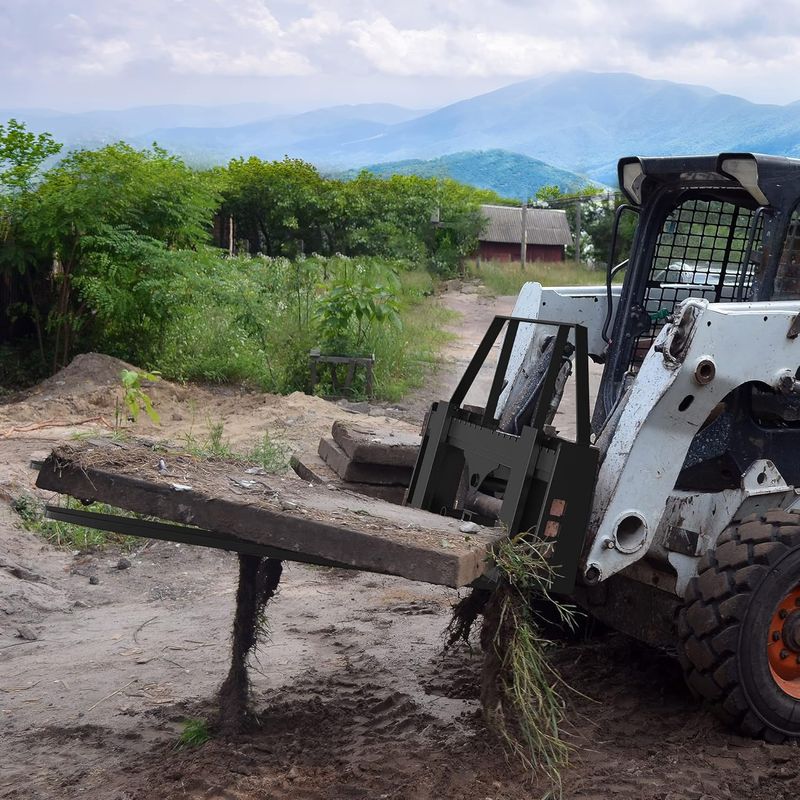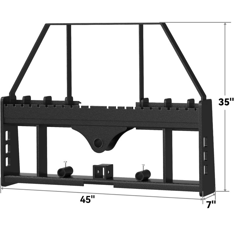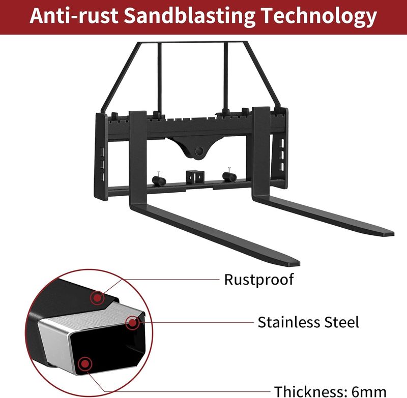 Adjustable Pallet Fork Blades: The pallet fork frame is a quick connect skid steer that can be directly installed to the machine. The pallet fork blade can be freely moved on the skid steer frame, and the distance can be adjusted within a 17"-37" range on the frame; The extended top bracket reduces timber slipping risk during handling