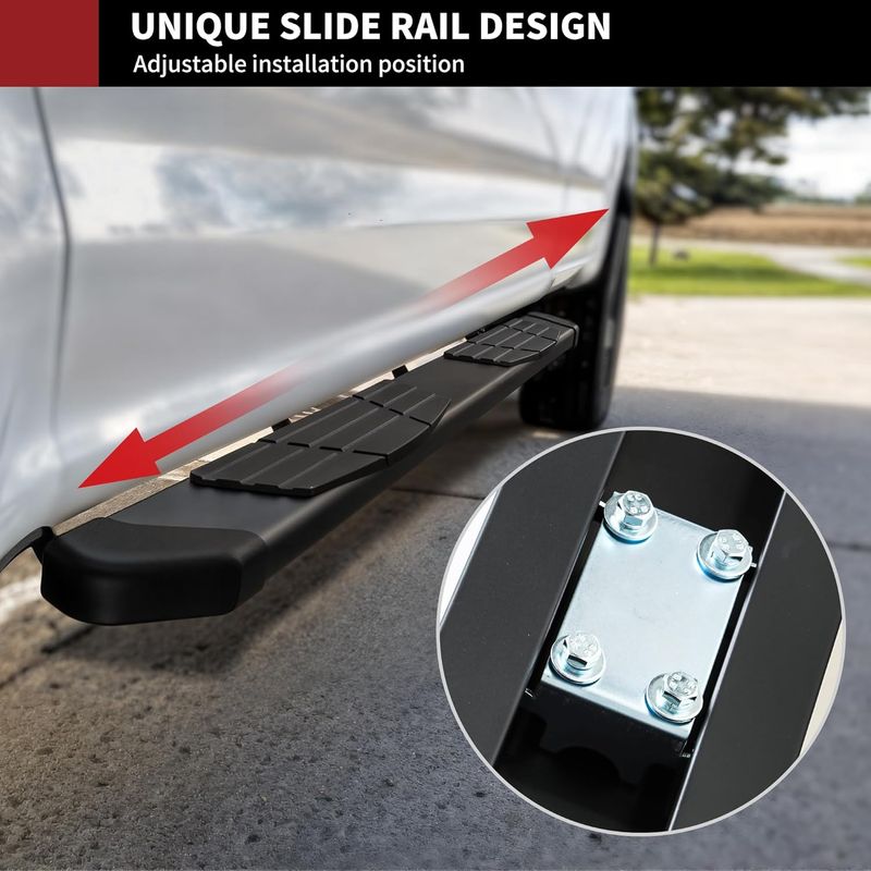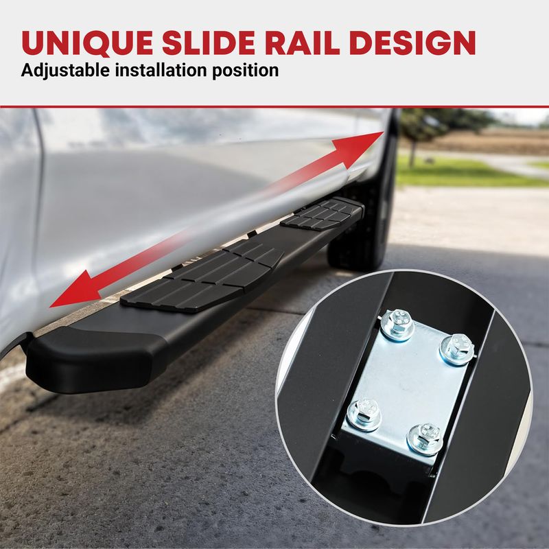 Easy to Install: Bottom slider design allows forward or backward adjustment for better customization; Easily bolt on the step bars to your vehicle with no cutting or drilling needed