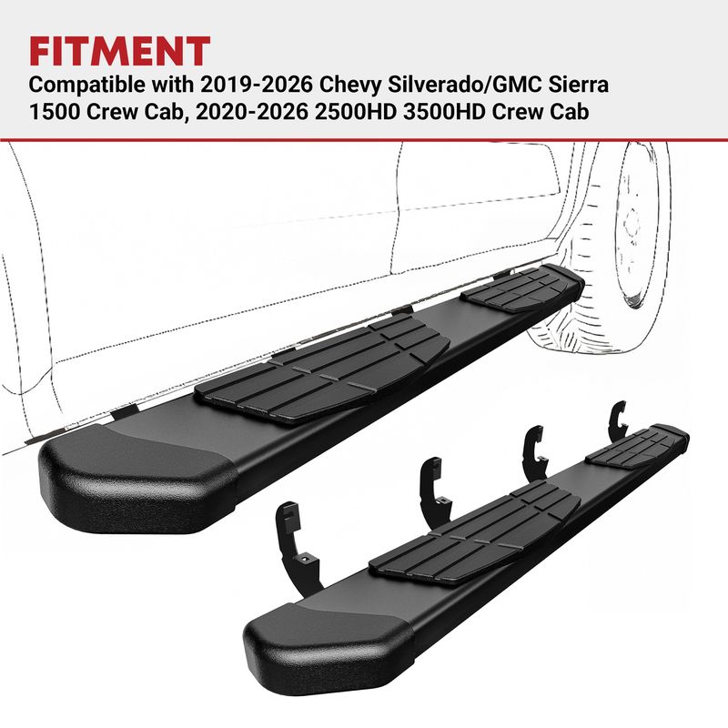 Custom Fit: YITAMOTOR running boards are compatible with 2019-2026 Chevrolet Silverado /GMC Sierra 1500 Crew Cab, 2020-2026 Silverado/Sierra 2500HD 3500HD Crew Cab (Excl. 2019 1500 LD), ensuring seamless integration and enhanced style