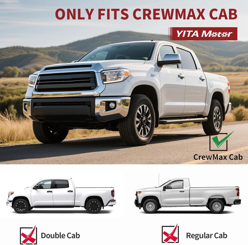 Vehicle Compatibility: YITAMOTOR running boards fit for 2022-2025 Toyota Tundra Crewmax cab, matching manufacturer-set mounting points for a secure, no-drill installation and reliable performance. Please check the cab picture in the listing before ordering.