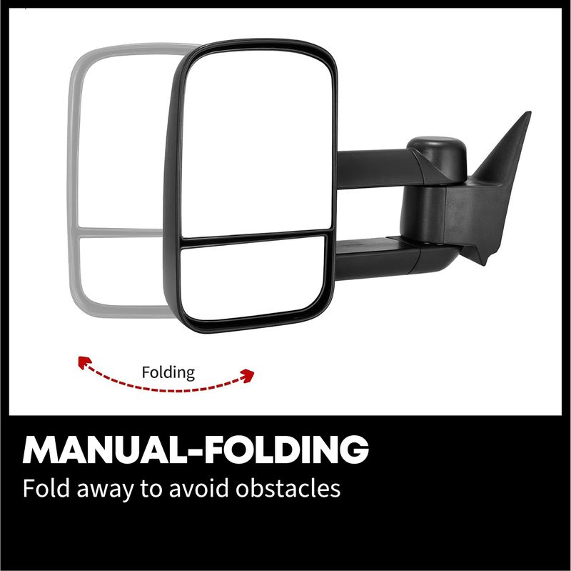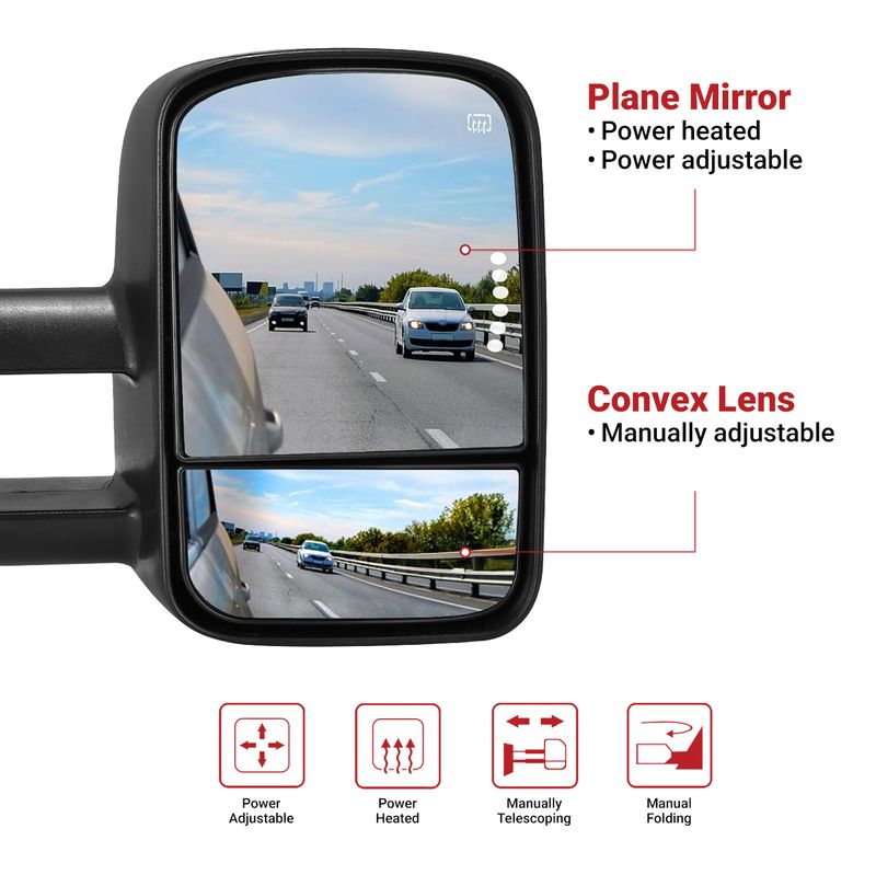 These towing mirrors are with power-adjusted upper plane glass and manually adjusted blind-spot convex mirrors, providing you with a better and wider rear view.