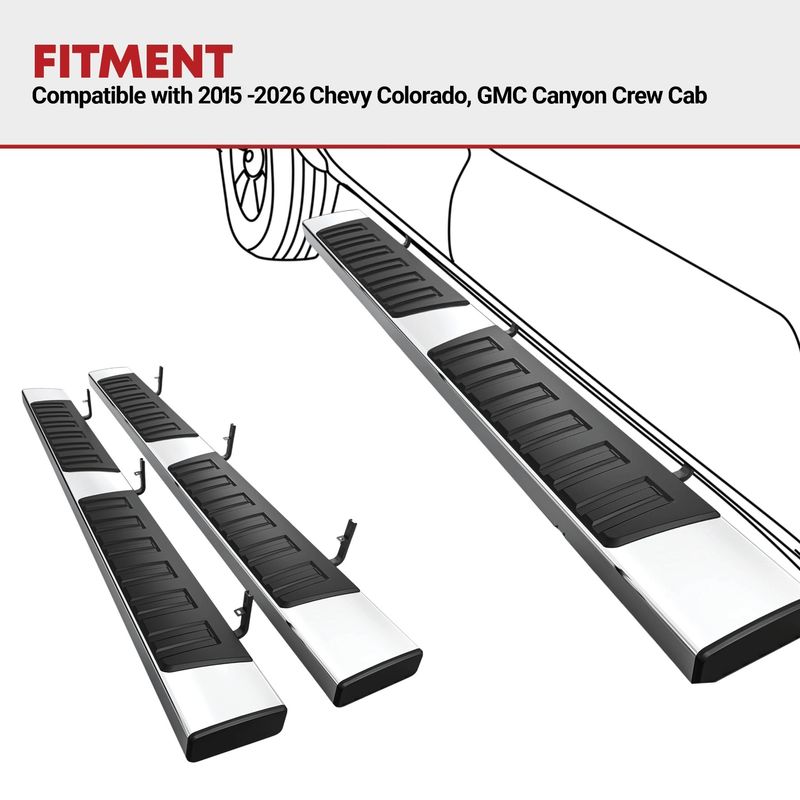 These 6" YITAMOTOR Running Boards perfectly fit the 2015-2025 Chevy Colorado/GMC Canyon Crew Cab. They are made of high-quality stainless steel, with a 450lbs weight capacity for each side. Plus, they are finished with a powder coat, corrosion-resistant.