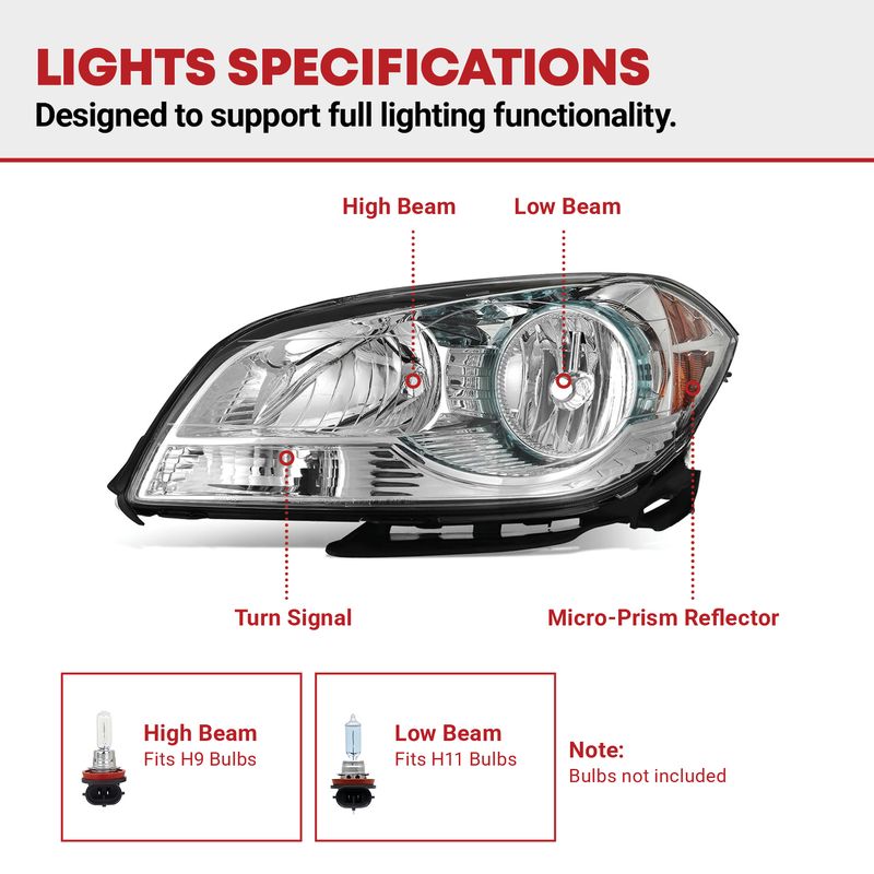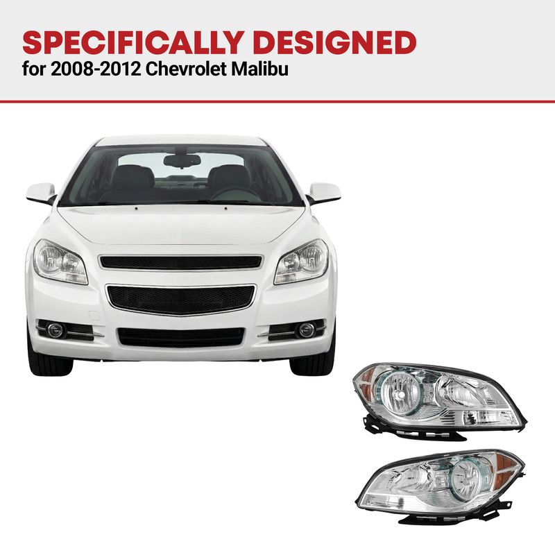 Compatibility: the headlight assemblies are compatible with 2008 2009 2010 2011 2012 08 09 10 11 12 Chevy Malibu 2008-2012 08-12. (Only Fits 2008 Chevy Malibu New Body, Not Fits 2008 Chevy Malibu Clasic). High Beam: H9; Low Beam: H11; Signal Light: 4157NA; Parking Light: 4157NA; Side Marker Light: 194. Bulbs are not included. OEM Part Number: 25984637, 25984638,22897127, 22897126. Partslink Number: GM2502307, GM2503307