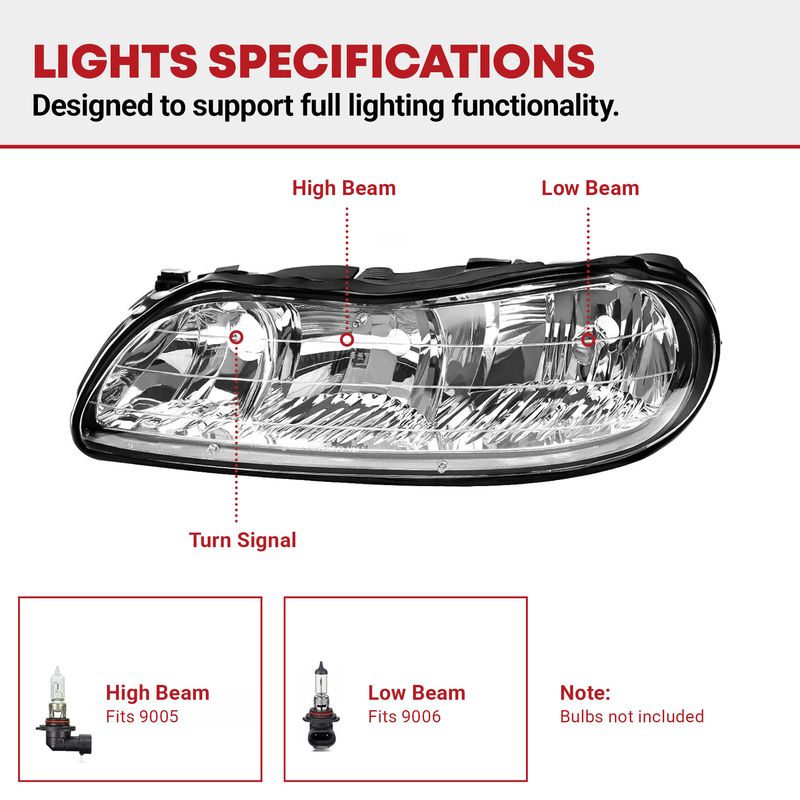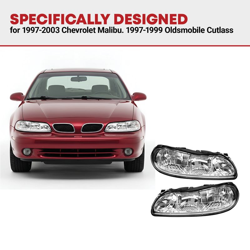 YITAMOTOR 1997 1998 1999 2000 2001 2002 2003 Chevy Malibu headlights, chrome housing clear lens, and clear reflector. The reinforced housing and lens of the headlight can bear great impact and shock when you drive on any rough terrain or mountain road; enjoy your off-road adventures freely!