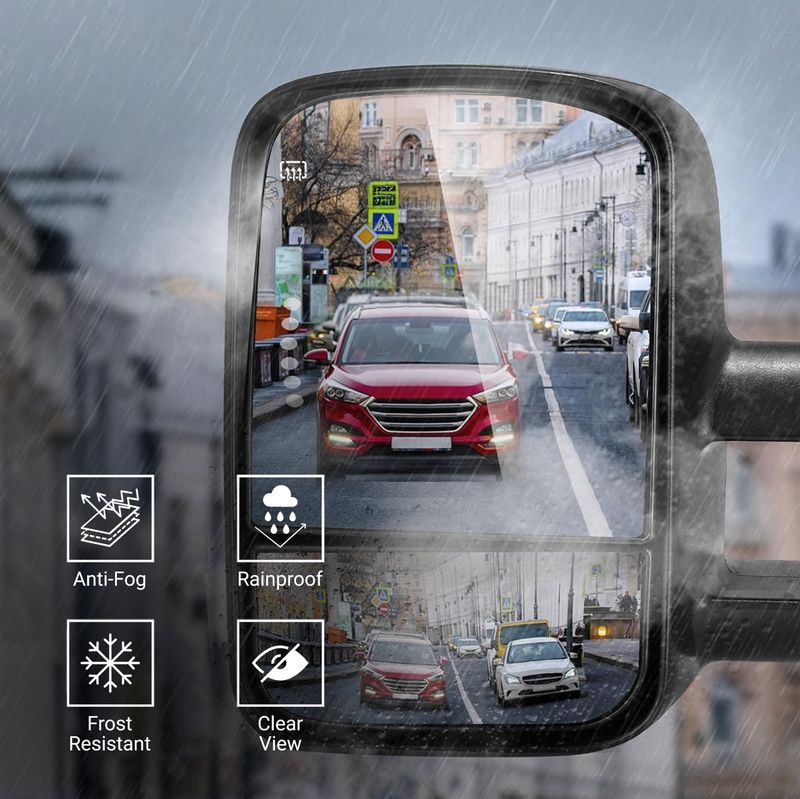 The power-adjustable flat mirror and manually adjustable convex lens enable you to flexibly adjust the rear view.