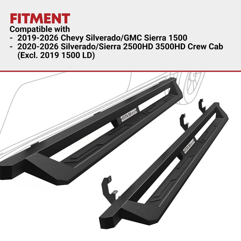 These running boards are perfectly compatible with the 2019-2025 Chevy Silverado / GMC Sierra 1500, and 2020-2025 Silverado/Sierra 2500HD 3500HD Crew Cab. YITAMOTOR is one of the largest automotive running boards and vehicle accessories retailers in the United States. We take pride in our quality control to ensure that we provide only the highest quality running boards and auto accessories to our customers.