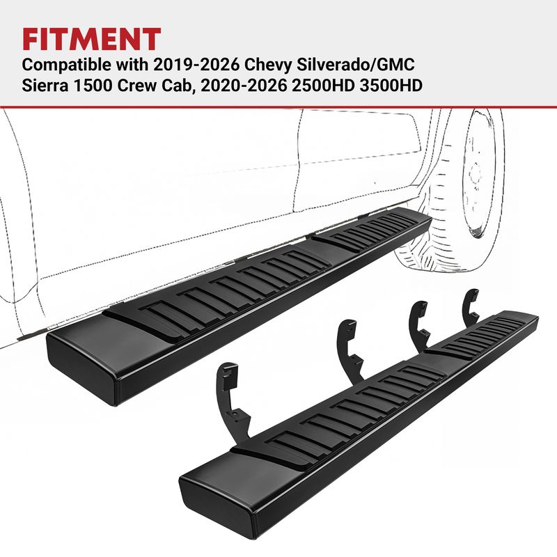 YITAMOTOR Running Boards Fit for 19-25 Chevy Silverado/GMC Sierra 1500 Crew Cab & 20-25 Silverado/Sierra 2500HD 3500HD Crew Cab Side Steps | Nerf Bars | Running Boards are made of anti-corrosion aluminum with UV resistant non-slip step pads. They can provide a secure, slip-proof, and comfortable step for the whole family.