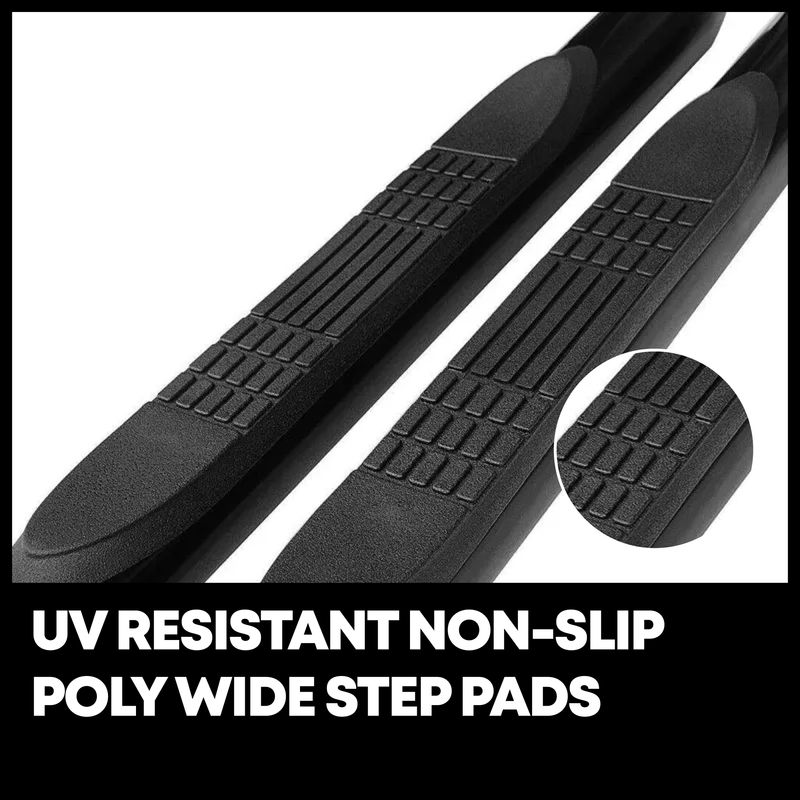 Step bar covers feature a textured surface that prevents slips and falls when getting in and out of your vehicle.