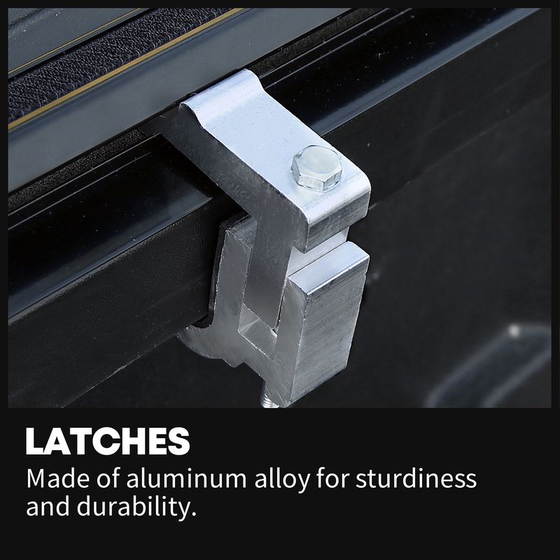 A latch lock and adjustable tension system on the end of the side rails keep the cover close tightly; sturdy clamps and buckles with straps protect the cover from sliding or blowing off while driving.