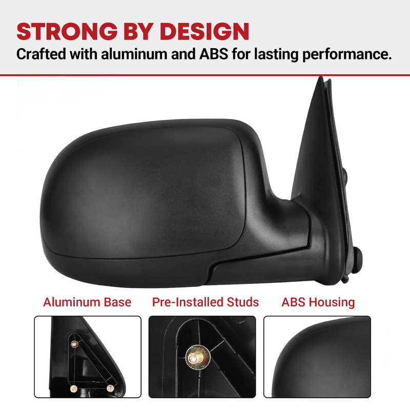 The towing mirrors feature a classic triangle construction, durable aluminum base, and pre-installed studs for a stable installation on your vehicle.