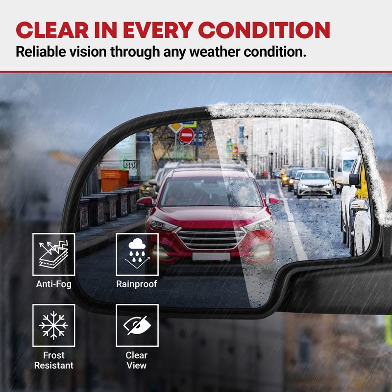 The upper plane glass of these mirrors is heated for defogging and defrosting. It can defog and defrost by itself, super convenient for you on a rainy or foggy day.