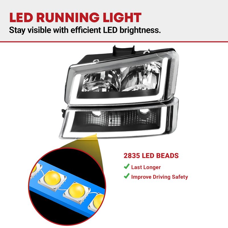 Chevy Silverado Headlights with LED DRL light, high beam mode (HB3/9005, bulbs not included), and low beam mode (HB4/9006, bulbs not included), allow you to drive more safely in any bad weather.
