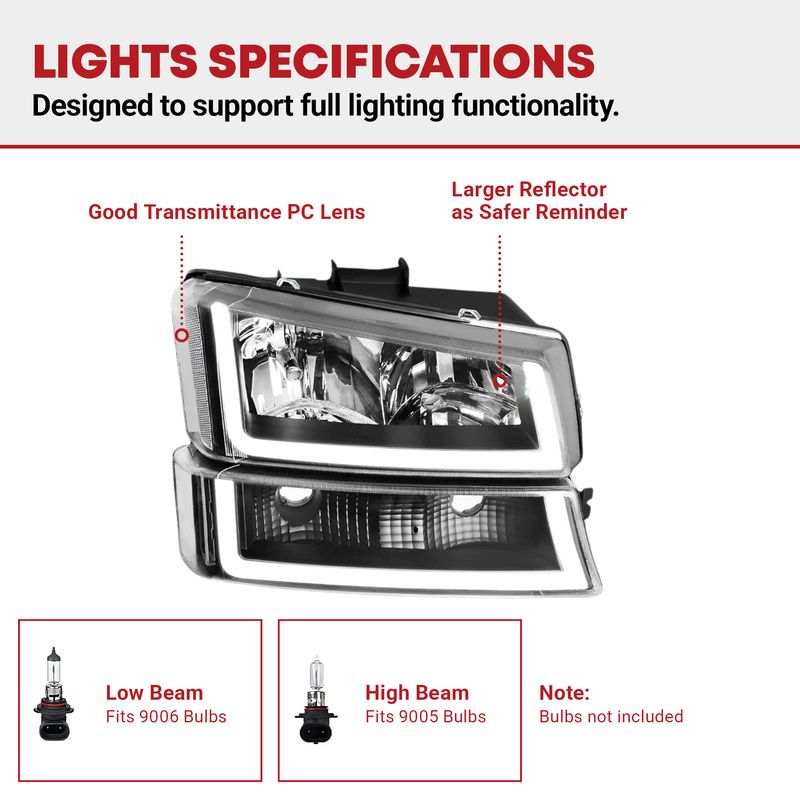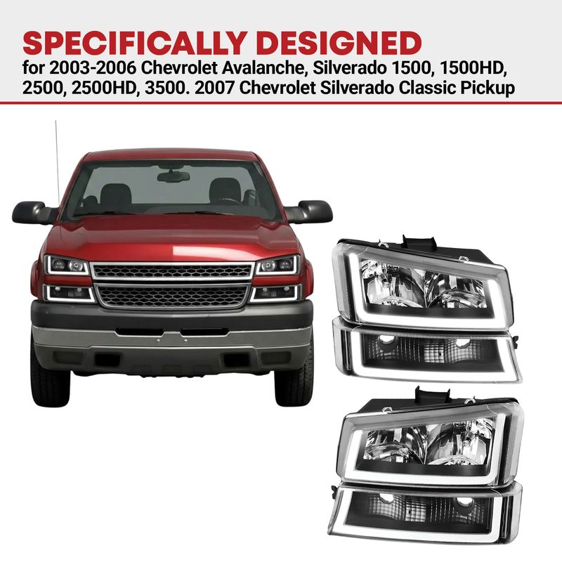 Compatibility: the headlight assemblies are compatible with 2003-2006 Chevy Silverado 1500/1500 HD / 2500 HD / 3500; 2003-2004 Chevy Silverado 2500; 2007 Chevy Silverado 1500/1500 HD/2500 HD/3500 Classic; 2003-2006 Chevy Avalanche 1500/2500 Pickup (Without Body Cladding); high beam bulb type: HB3/9005; low beam bulb type: HB4/9006; bulbs are not included