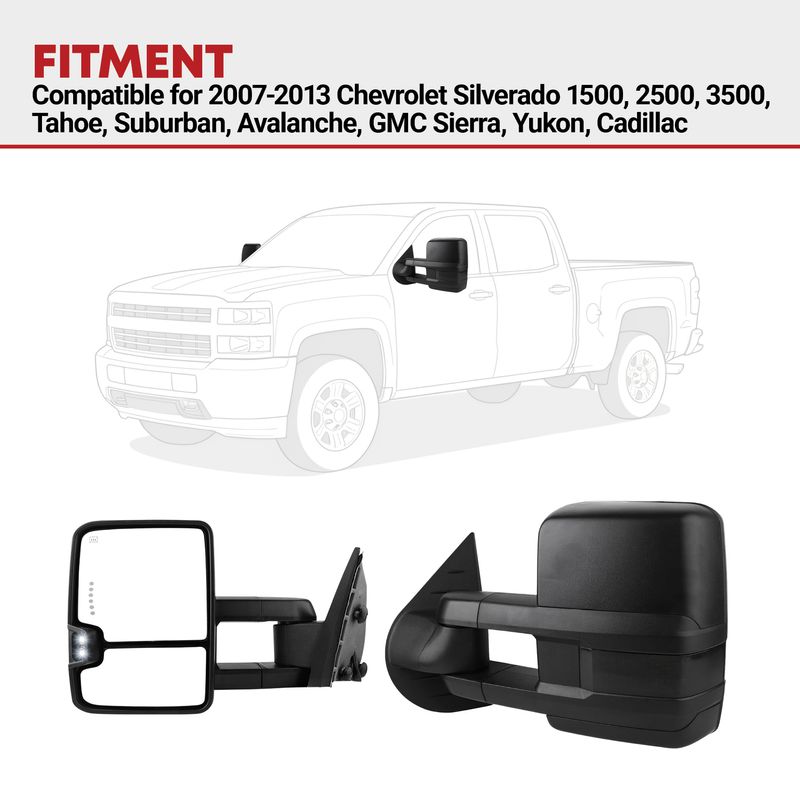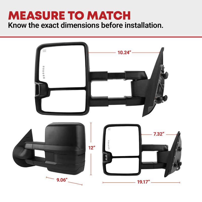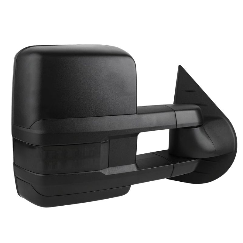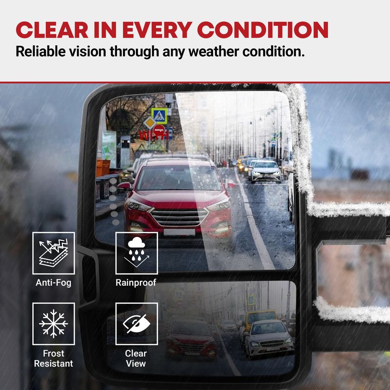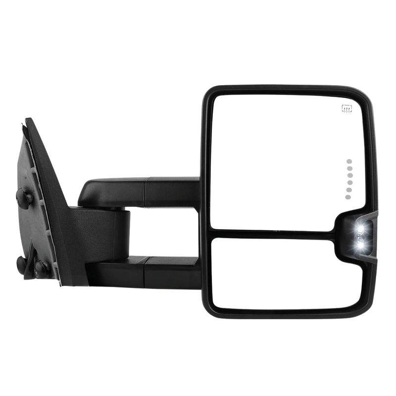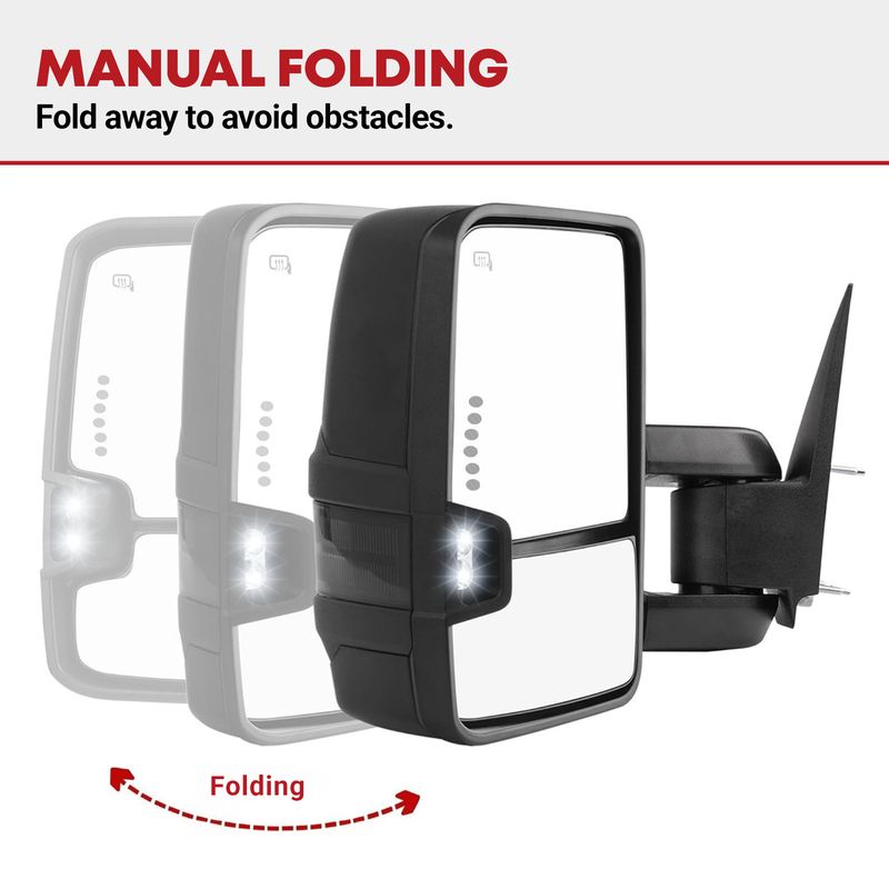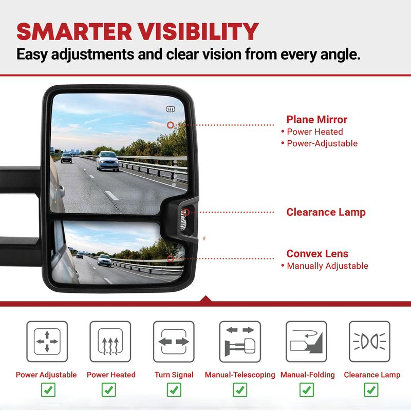 Upgrade your vehicle's visibility and safety with these manual extendable tow mirrors. Featuring a built-in manual convex blind spot mirror and power-heated functionality, these mirrors ensure a clear view in any weather. The smoked lens LED turn signals and integrated clearance lamp enhance visibility for other drivers. Designed with durable plastic housing and a textured black finish, these mirrors are both stylish and rugged. Reinforcement brackets minimize vibrations for a stable view, while the easy installation process saves you time. Backed by a limited 1-year warranty for added peace of mind. Perfect for towing and everyday use.