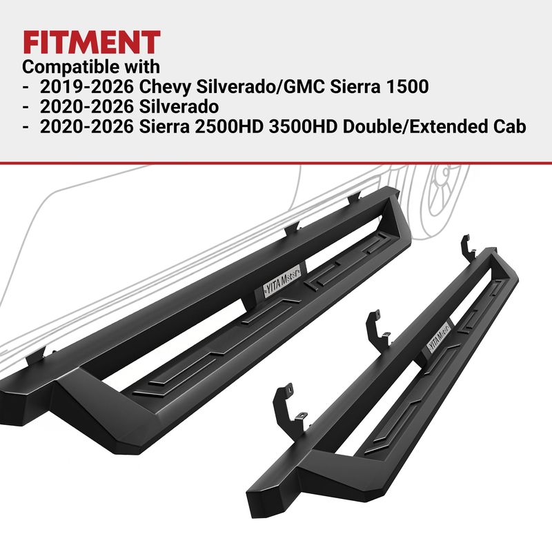 These running boards are perfectly compatible with the 2019-2025 Chevy Silverado/GMC Sierra 1500, and 2020-2025 Silverado/Sierra 2500HD 3500HD Extended/Double Cab. YITAMOTOR is one of the largest automotive running boards and vehicle accessories retailers in the United States. We take pride in our quality control in assuring that we provide only the highest quality running boards and auto accessories to our customers.