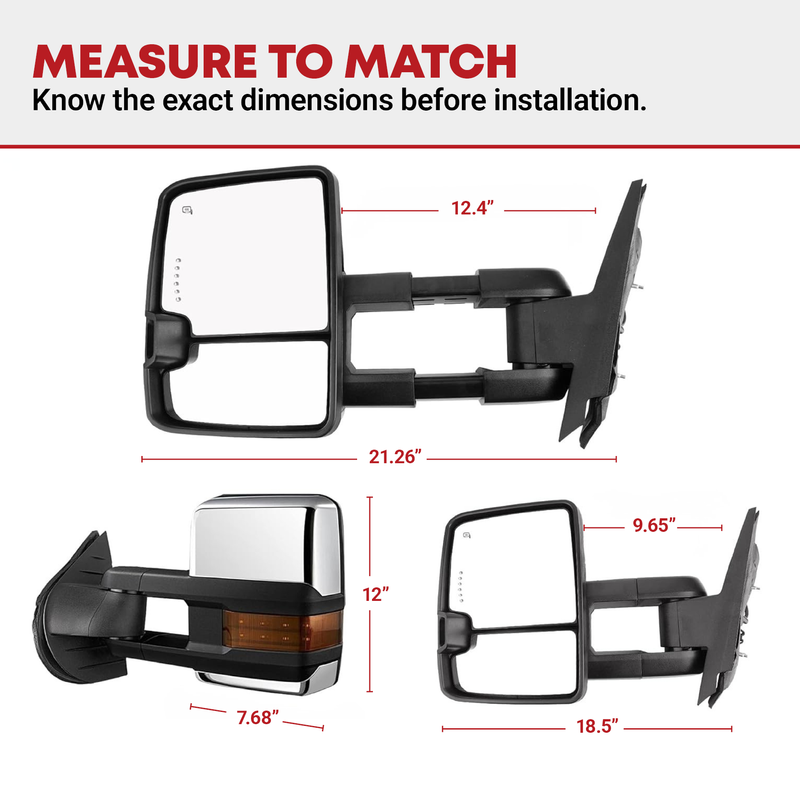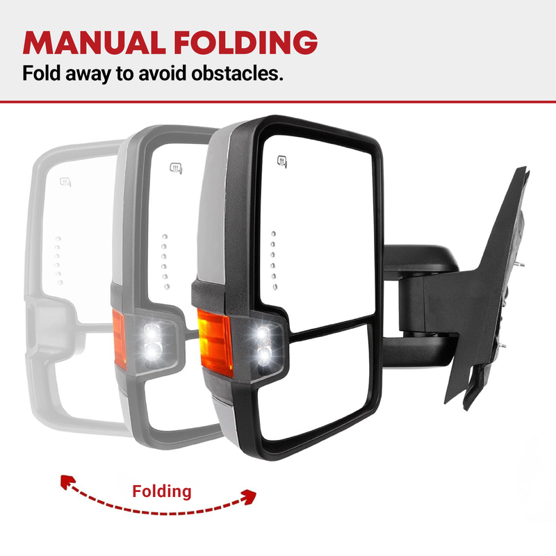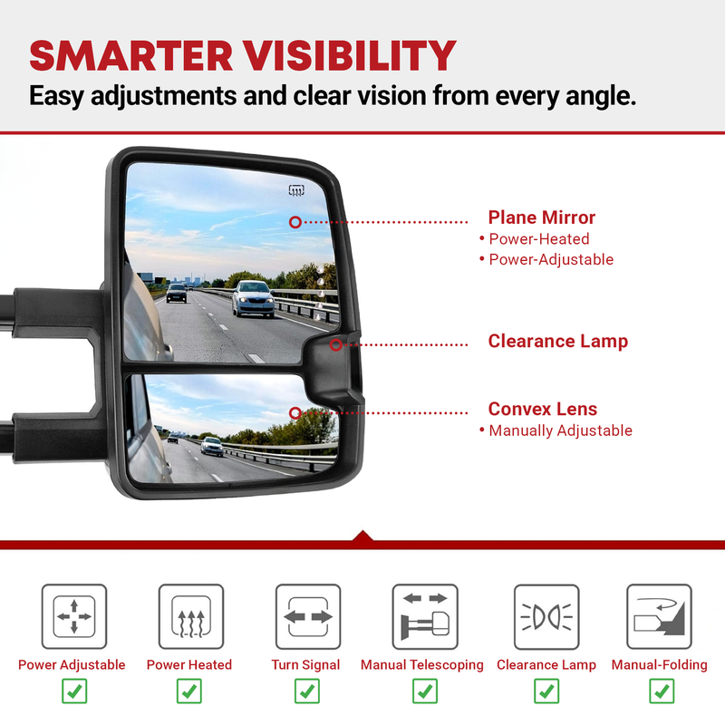 YITAMOTOR Towing mirrors expand outward farther than the standard truck mirrors, expanding your aft vision to assist with giving a more secure towing experience. We offer extendable towing mirrors with power-heated upper glass and a turn signal light.