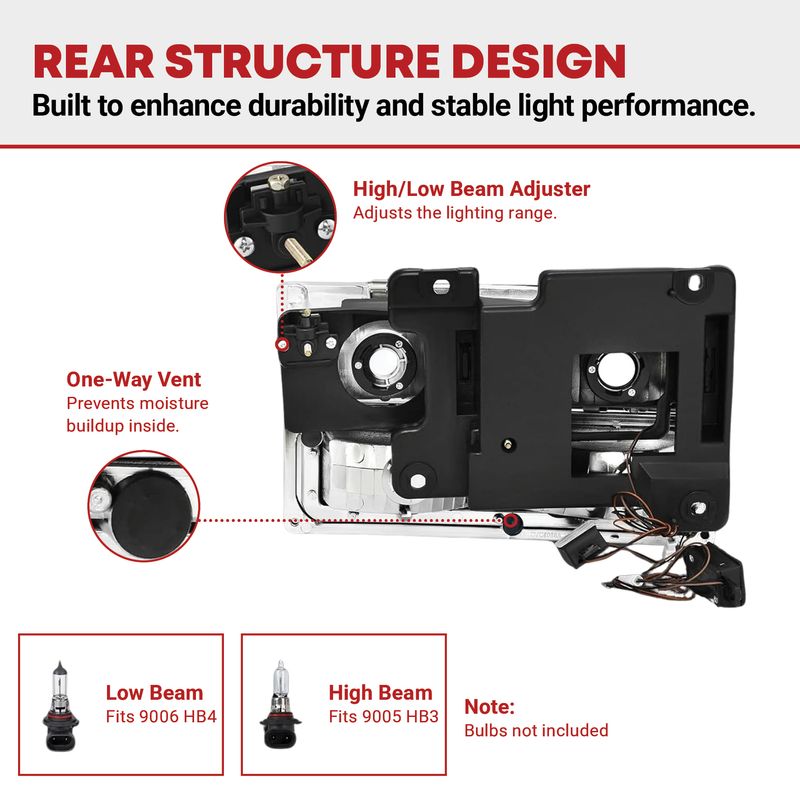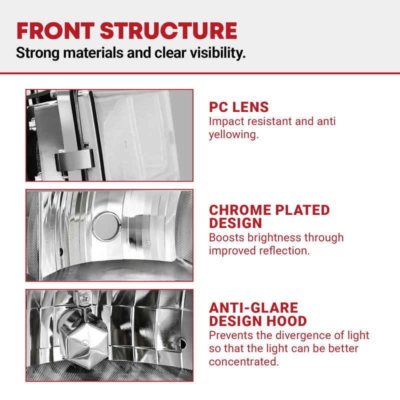 Factory-style headlights are identical to the original unit in every way— the same quality and the same method of installation. And every headlight assembly undergoes strict testing before it leaves the factory. All wiring is rigorously tested to ensure the light is completely functional. A new pair of headlights can provide you with up to 50% more illumination than dull, yellowed, sandblasted, broken, or scratched headlights.