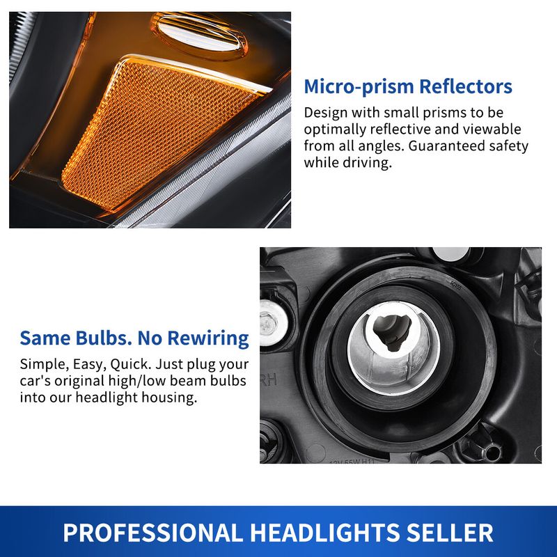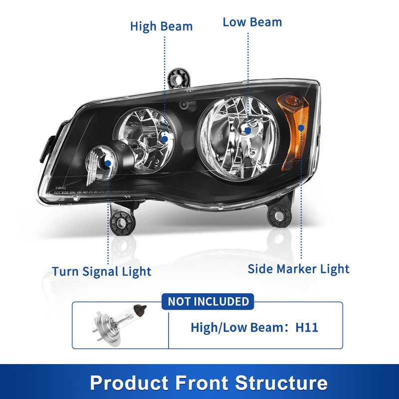 Compatibility: the headlight assemblies are compatible with 2011-2019 Dodge Grand Caravan / 2008-2016 Chrysler Town & Country (Not compatible with Factory Xenon HID Projector headlight models); high beam/low beam bulb type: H11; bulbs are not included