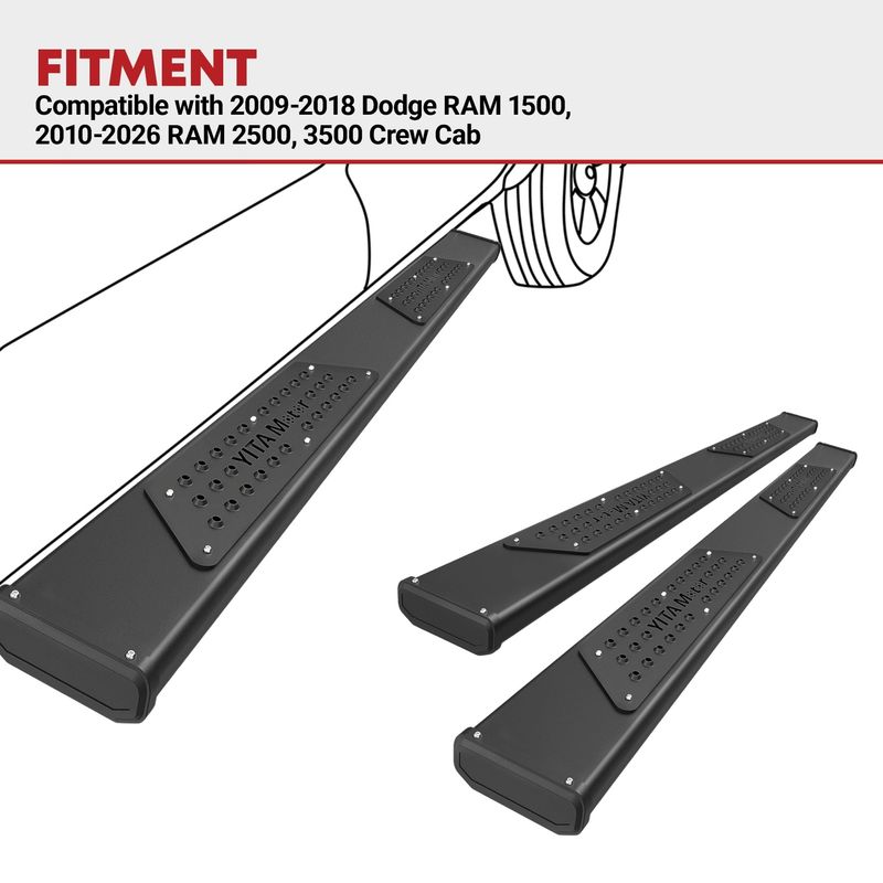 These YITAMOTOR Running Boards perfectly fit 09-18 RAM 1500/10-24 RAM 2500 3500 Crew Cab. They are made of Anti-corrosion aluminum with UV-resistant non-slip step pads.