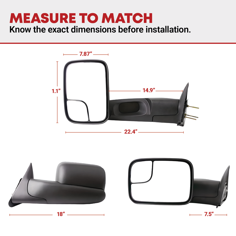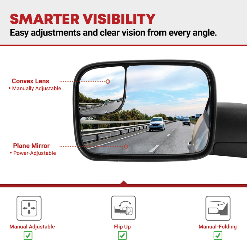 YITAMOTOR Towing mirrors extend outward further than the standard truck mirrors, increasing your rearward vision to help provide a safer towing experience. We offer manual and power-adjustable, extendable telescoping towing mirrors to maximize visibility, and are available with the heating feature to eliminate frost.