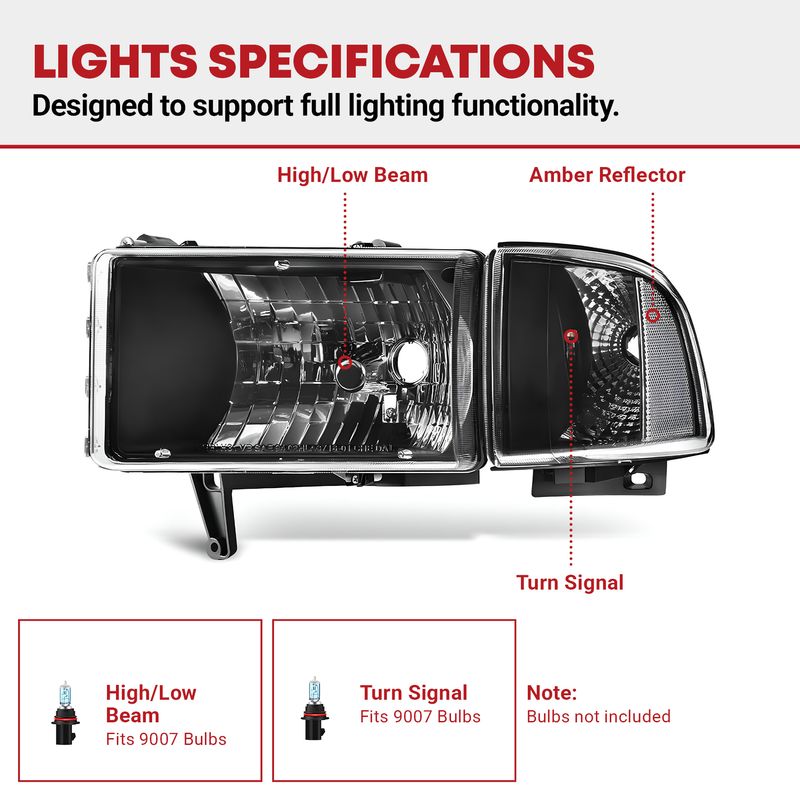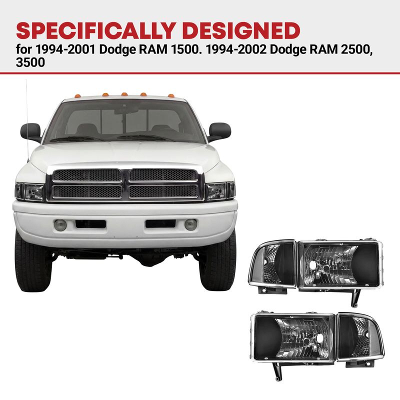 Vehicle compatibility: headlights assembly compatible with 1994-2001 dodge ram 1500, 1994 1995 1996 1997 1998 1999 2000 2001 2002 dodge ram 2500 3500; high beam/low beam bulb type: 9007(HB5); bulbs are not included