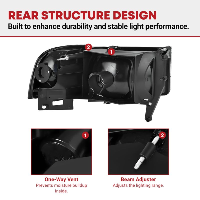 Factory-style headlights are identical to the original unit in every way— the same quality and the same method of installation. And every headlight assembly undergoes strict testing before it leaves the factory. All wiring is rigorously tested to ensure the light is completely functional. A new pair of headlights can provide you with up to 50% more illumination than dull, yellowed, sandblasted, broken, or scratched headlights.