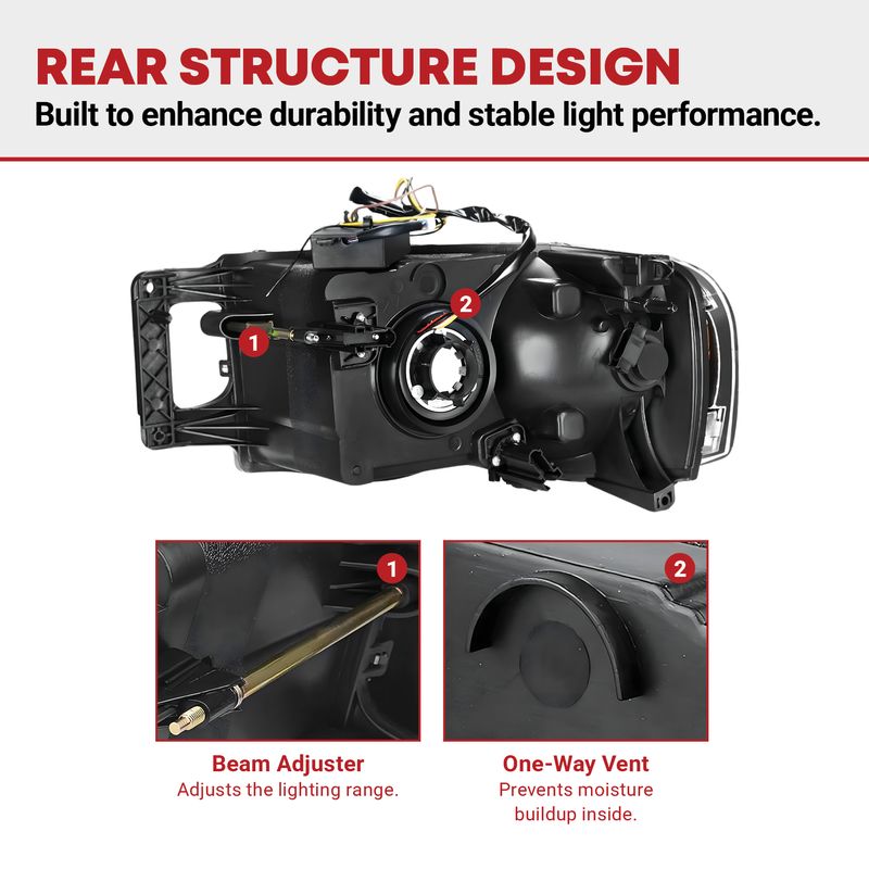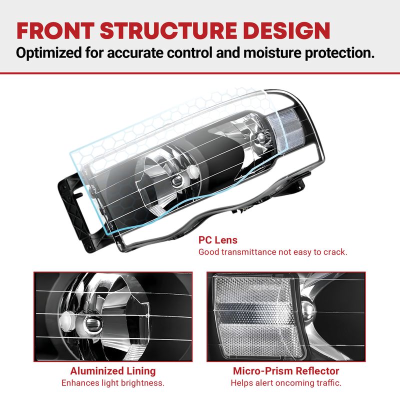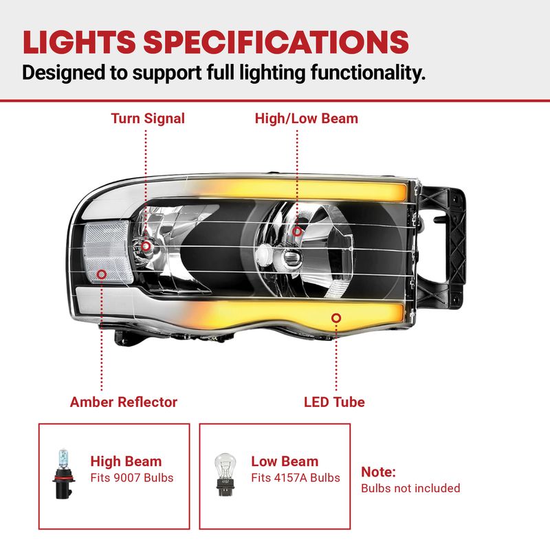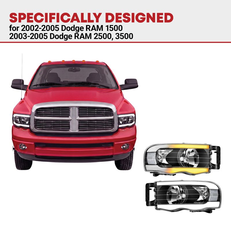 Vehicle Fitment - These headlights are compatible with 2002-2005 Dodge Ram 1500 / 2003-2005 Dodge Ram 2500 3500; high/low beam bulb type: 9007 (Halogen Bulbs are not included)
