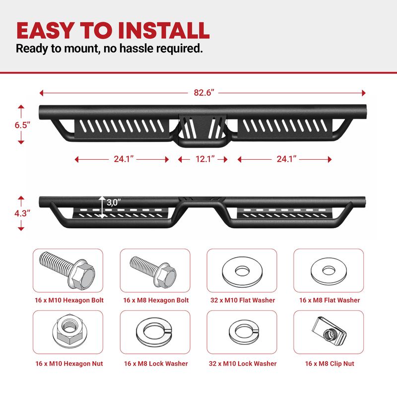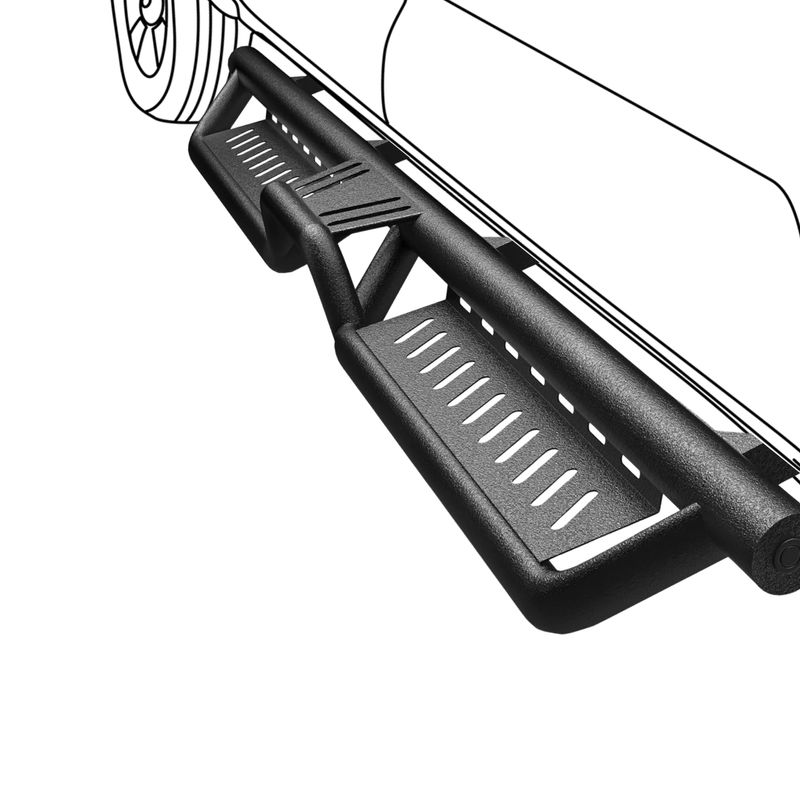 Dual-Step Structure: Featuring a practical two-tier step design, these side steps make entering and exiting your vehicle simple for passengers of all ages. The elevated center section also makes it easier to access rooftop gear or load cargo.