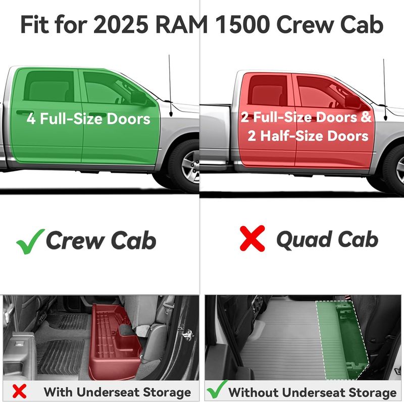Custom Fit: These floor mats are compatible with 2025 Ram 1500 crew cab without Rear Underseat Storage, Bucket Seat, not for vehicles with vinyl floors; 3D laser scanning technology gives full protection to both the front and back
