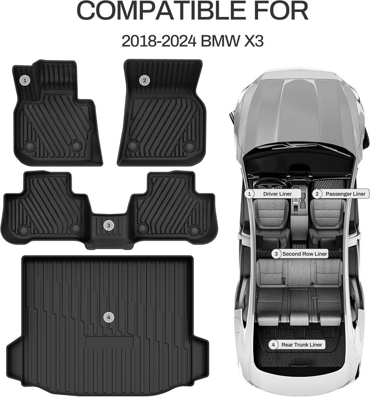 Custom fit: Floor mats & cargo liner fit for BMW X3 30i/M40i/M Competition/M 2018-2024,Our floor liners feature a 3D design that fits perfectly, accommodating the details of the accelerator/brake for seamless driving