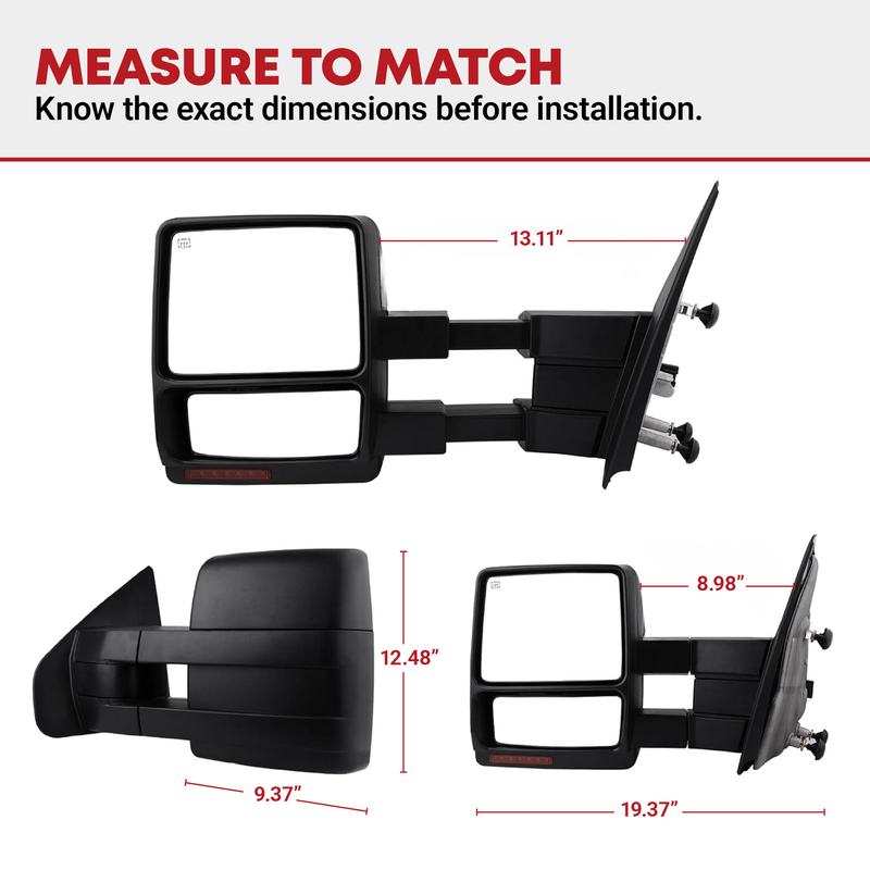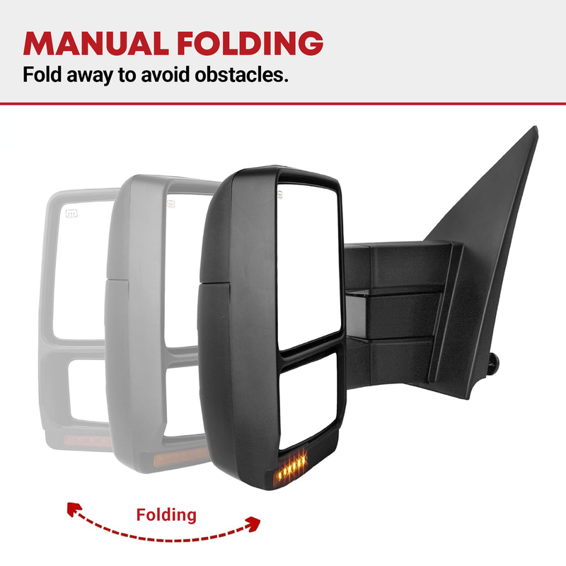 Towing mirrors are specifically designed for towing trailers.YITAMOTOR Towing mirrors extend outward further than the standard truck mirrors, increasing your rearward vision to help provide a safer towing experience. We offer manual and power-adjustable, extendable telescoping towing mirrors to maximize visibility, and are available with the heating feature to eliminate frost. We also have towing mirrors with LED lights that synchronize to your turn signals.